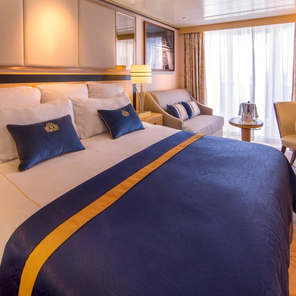 Užijte si nadstandardní služby Cunard, jako je přednostní nalodění a vylodění, bezplatná pramenitá voda a speciální zařízení na přípravu čaje a kávy.