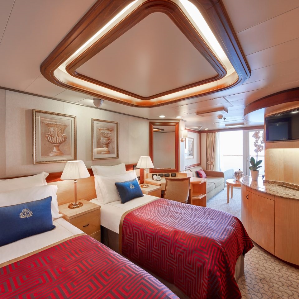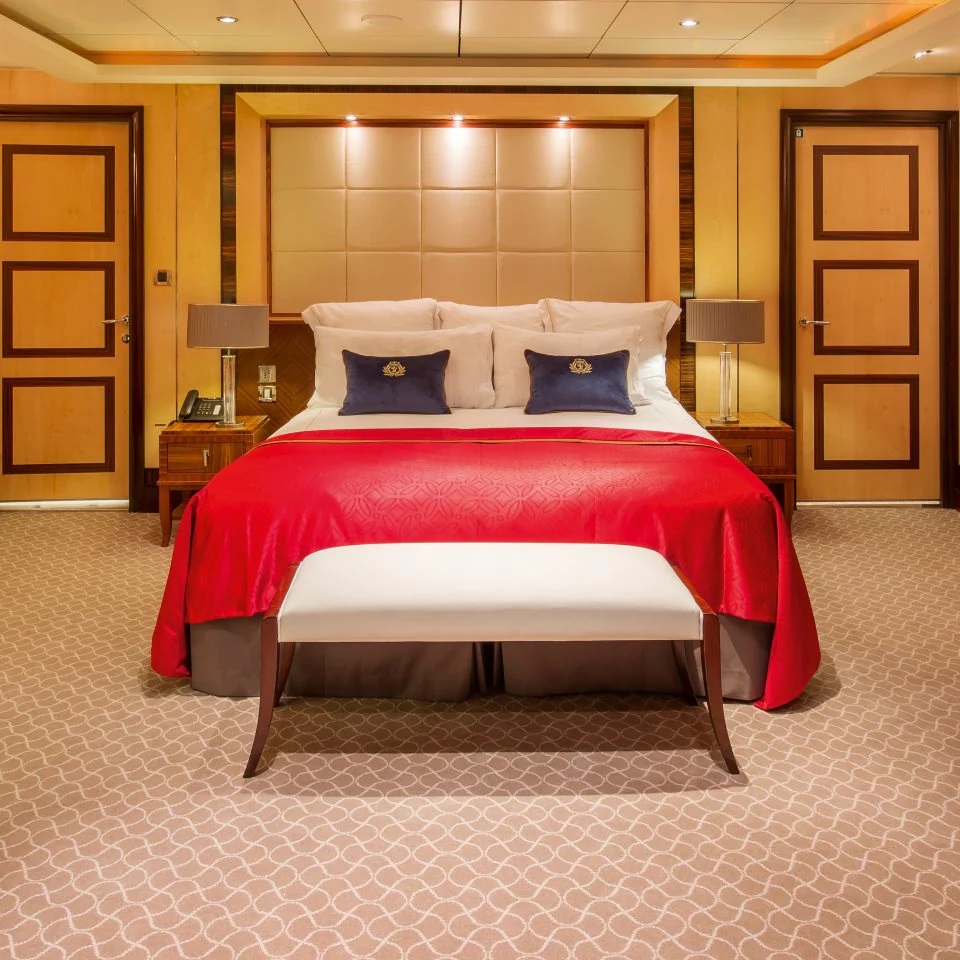 Velkoryse prostorná kajuta je vybavena stolem, posezením a velkou postelí a navíc prostorným balkonem se stolem a židlemi, kde můžete relaxovat na mořském vzduchu.