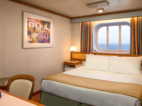 Standardní vybavení kajut: koupelna se sprchou a toaletou, 2 lůžka s možností konfigurace, úložné prostory, minibar, fén, TV.