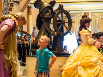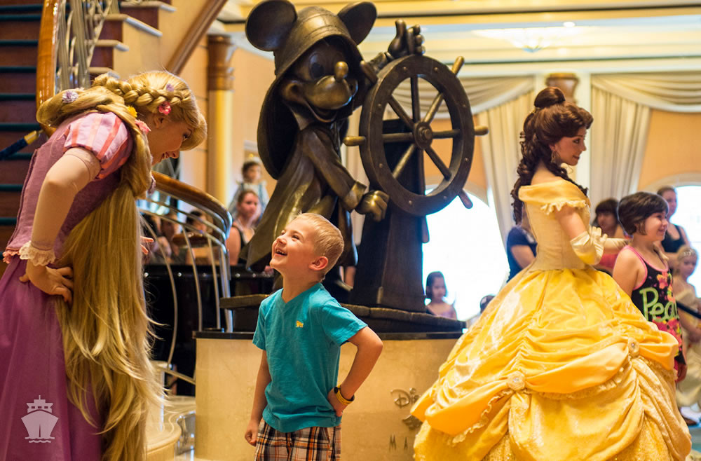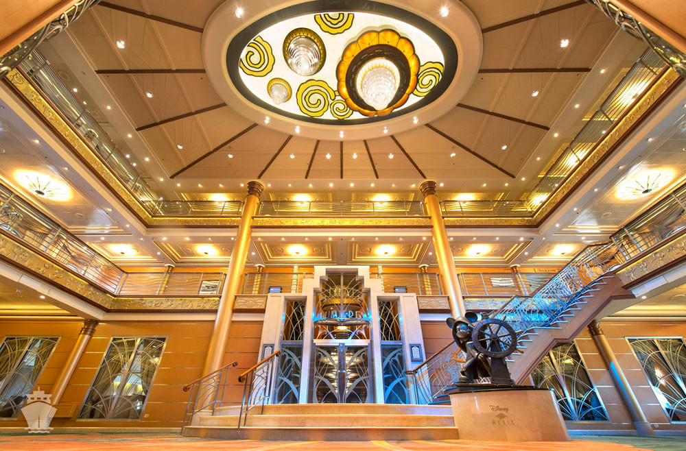 - Magic 's Atrium (centrální část lodi, přes 3 paluby, s bronzovou sochou "Helmsman Mickey")