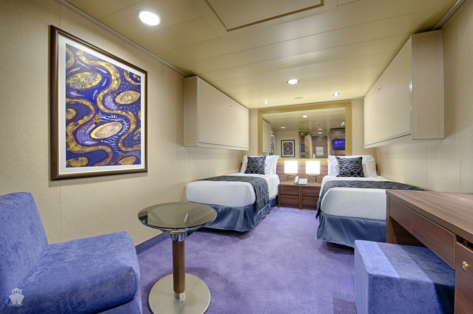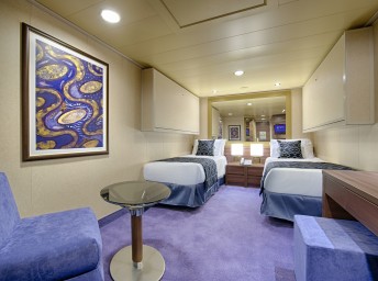 Kajuta vnitřní: 13 - 16 m², kajuta s manželskou postelí (na požádání 2 oddělené postele) a 1-2 vyklápěcí horní lůžka. Klimatizace, koupelna se sprchou a WC, toaletní stolek, skříň, interaktivní TV, sejf, telefon, vysoušeč vlasů.