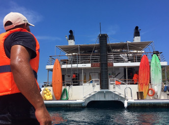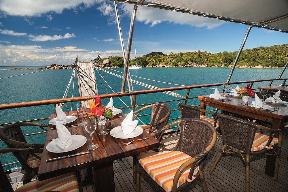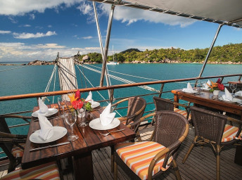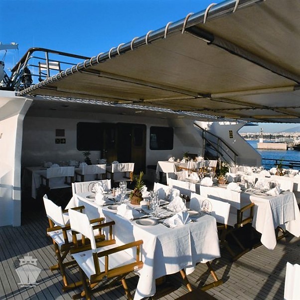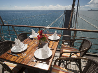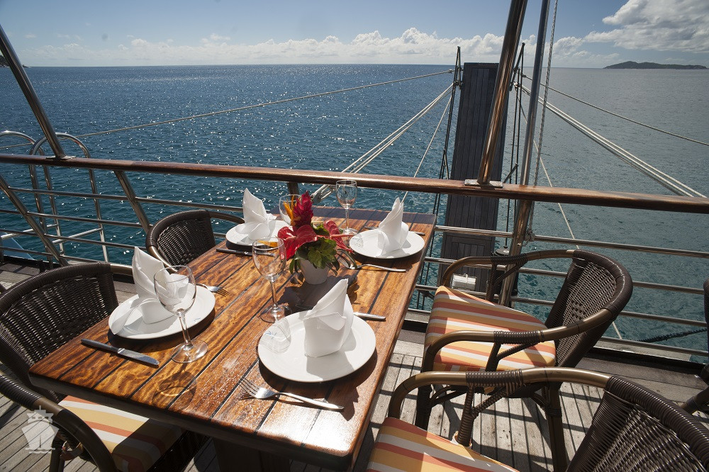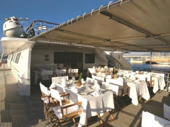 Na vnější palubě je také stíněná jídelní část s výhledem na moře, kde se odehrávají obědy formou bohatého bufetu. V průměru dvakrát týdně se koná barbecue přímo na palubě nebo na břehu.