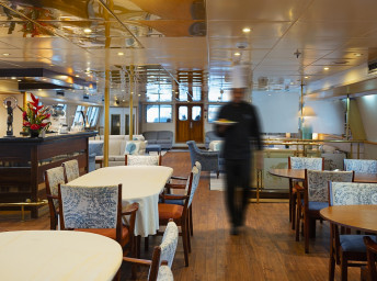 Prostorná a prosvětlená jídelna na palubě Upper Deck s velkými okny podél celé místnosti. Podávají se zde bufetové snídaně s výborným výběrem a a la carte večeře - bez turnusů a bez stanoveného zasedacího pořádku.