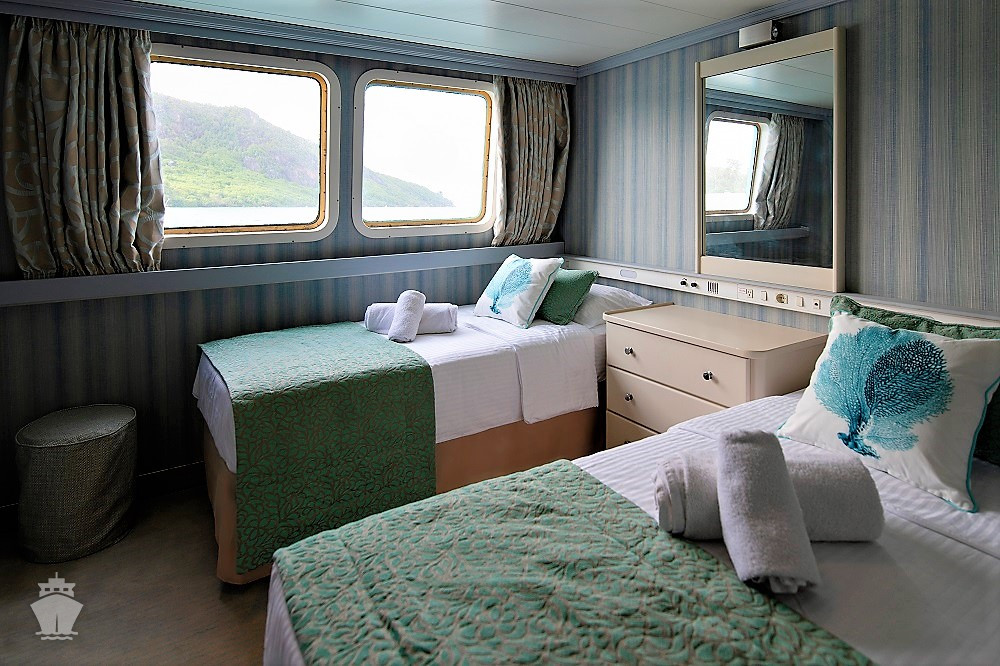 Vybavení kajut: koupelna se sprchou, regulovatelná klimatizace, kanál s reprodukovanou hudbou, Tv, telefon pro vnitřní použití, bezpečnostní schránka, mini bar, vysoušeč vlasů.