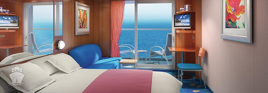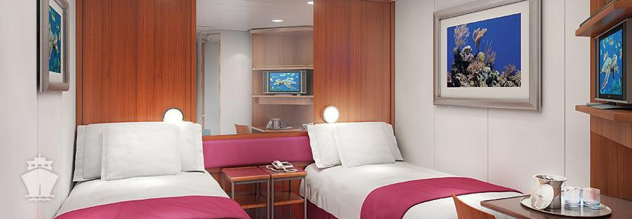 koupelna se sprchou a WC, 2 lůžka, v některých kajutách možnost přistýlek, toaletní stolek, úložné prostory, interaktivní TV, sejf, telefon, vysoušeč vlasů.