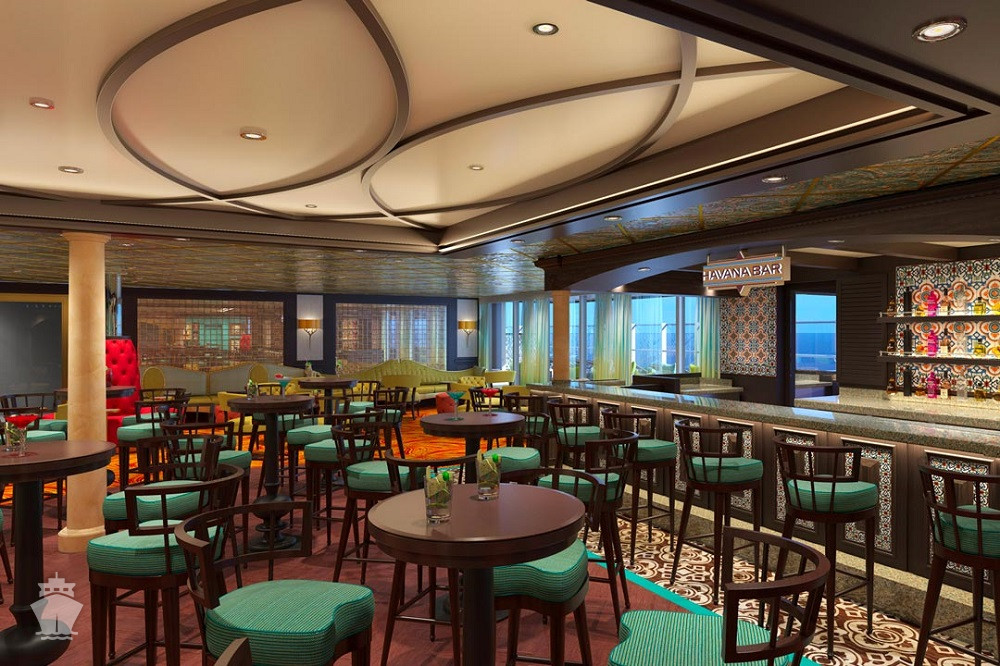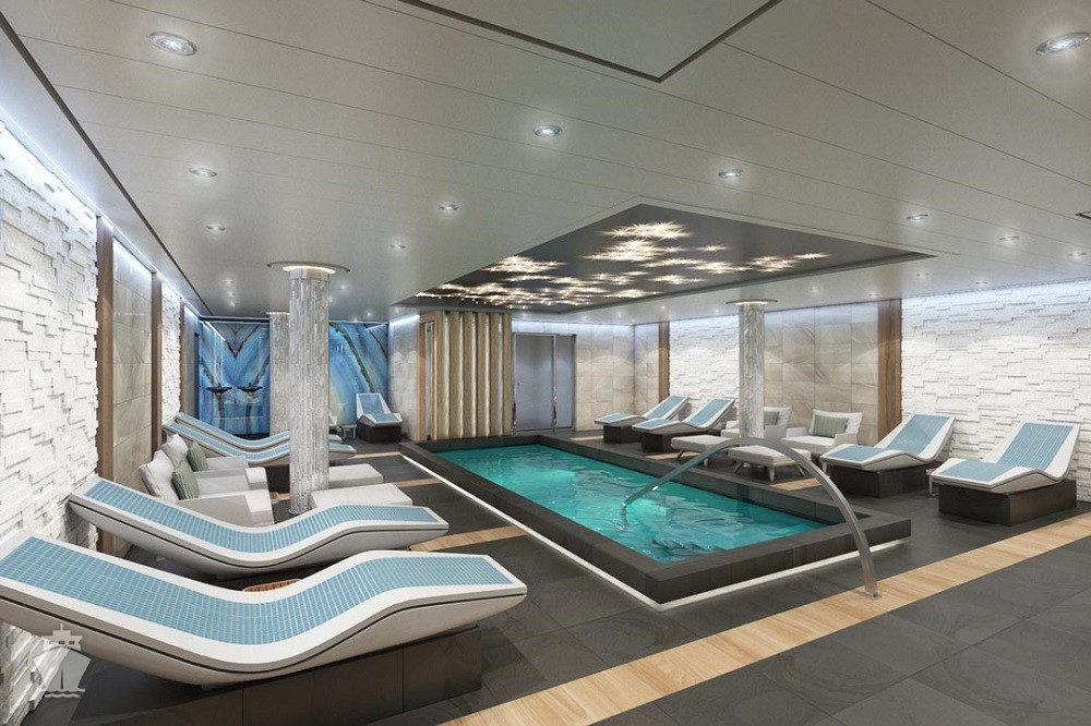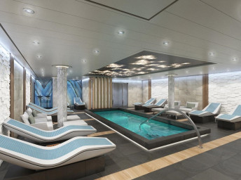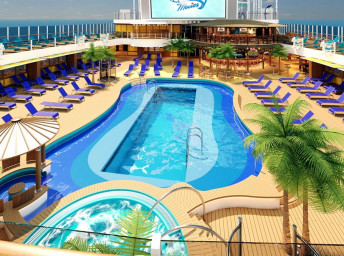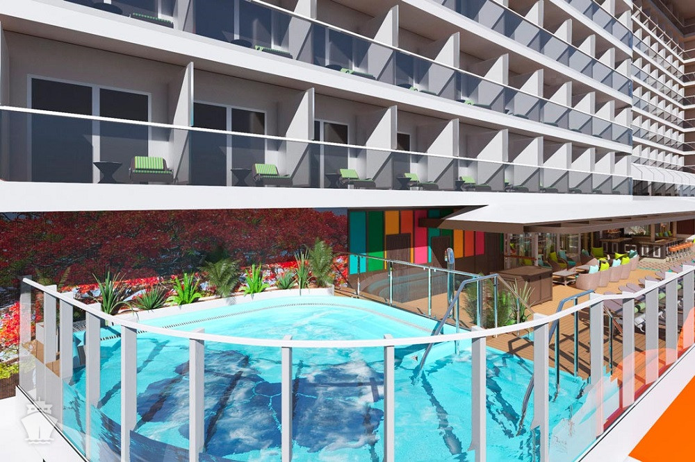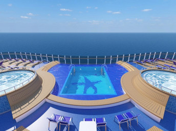 Serenity (18. paluba) 8:00 - 23:00. Odpočinková zóna pro dospělé 21+ s bazénem, barem, lehátky a křesly a 2 vířivkami.