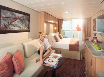 Základní vybavení všech kajut: koupelna s WC, fén, toaletní potřeby; lůžka, dostatek úložných prostor, toaletka se zrcadlem, individuálně nastavitelná klimatizace, TV, župany, trezor, minibar.