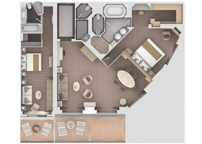 | SV - Superior Veranda Suite 36 m² / balkon 6 m². Vyšší paluby. Ložnice s obývací částí. | 572 845 Kč 572 845 Kč za osobu | ||