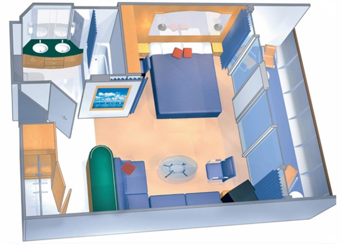 Všechny kajuty jsou příjemně zařízené, mají koupelnu se sprchou a WC, dostatek úložných prostor, 2 lůžka (někdy možnost přistýlek), toaletku se zrcadlem a fénem, TV, klimatizaci a trezor.