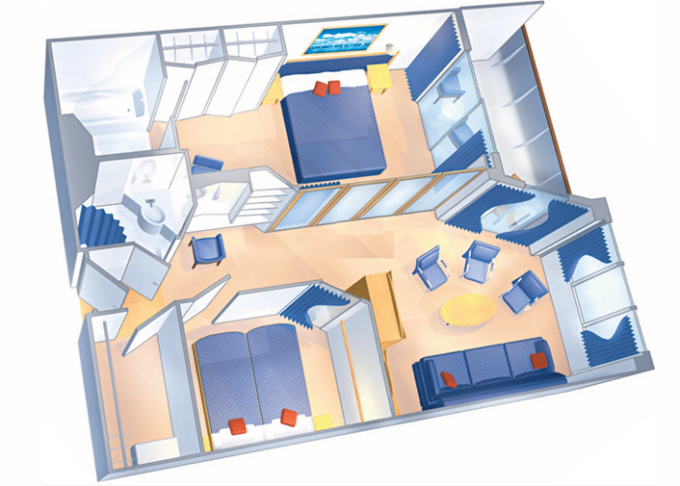 | VO - Ocean View Suite (bez balkonu) / 2 ložnice 44,5 m². Panoramatické neotevíratelné okna. Výhody Royal Suite Class. 8. paluba. Max 8 osob. | 94 279 Kč 94 279 Kč za osobu |
