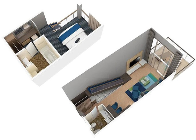 | L1 - Crown Loft Suite s balkonem 50 m² / balkon 10 m². 2-podlažní apartmán. Výhody Royal Suite Class. 17. paluba. Max 4 osoby. | 292 357 Kč 146 179 Kč za osobu | ||