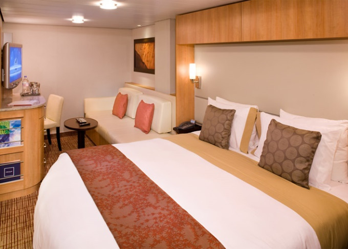 Základní vybavení všech kajut: koupelna s WC, fén, toaletní potřeby; lůžka, dostatek úložných prostor, toaletka se zrcadlem, individuálně nastavitelná klimatizace, TV, župany, trezor, minibar.