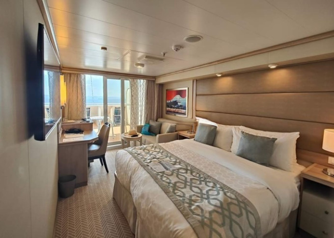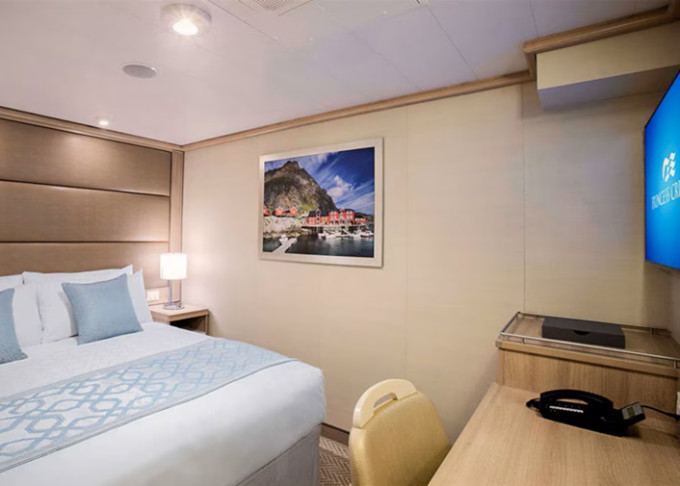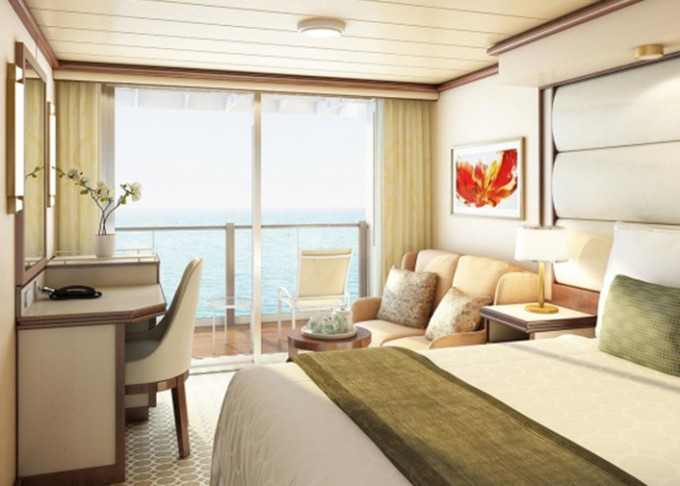 Standardní vybavení kajut: koupelna se sprchou a toaletou, 2 lůžka s možností konfigurace, úložné prostory, minibar, fén, TV, trezor. Balkony je vybaven malým stolkem a 2 židlemi či lehátky.
