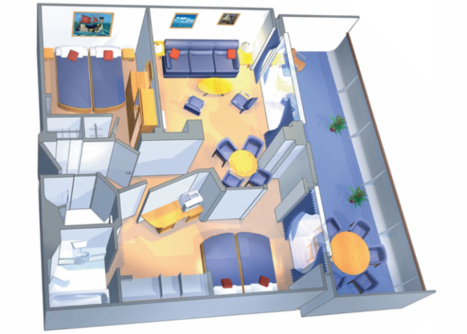 | GT - Grand Suite s balkonem / 2 ložnice 57 m² / balkon s vířivkou 22 m². Výhody Royal Suite Class. 8/9. paluba. Max 8 osob. | 146 553 Kč 48 851 Kč za osobu | ||