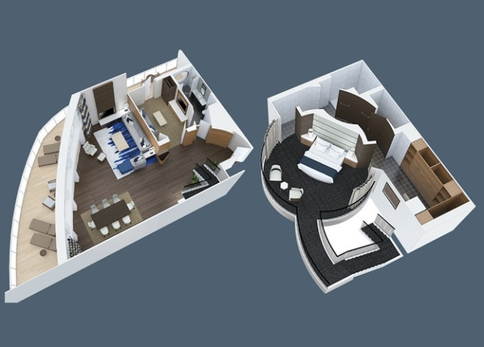 | SL - Sky Loft Suite s balkonem 69 m² / balkon 17 m². 2-podlažní apartmán. Výhody Royal Suite Class. 8/10. paluba. Max 4 osoby. | 102 150 Kč 51 075 Kč za osobu | ||