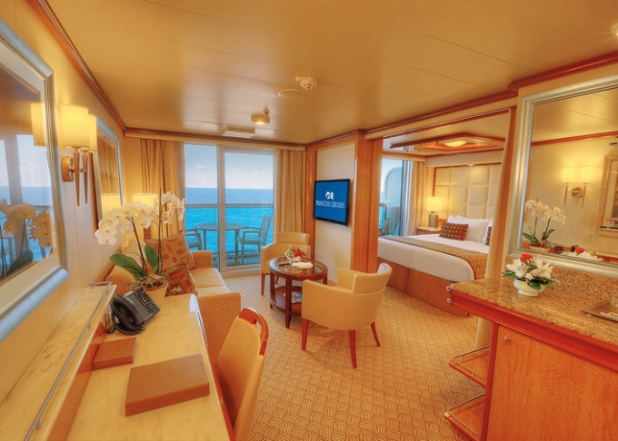 Standardní vybavení kajut: koupelna se sprchou a toaletou, 2 lůžka s možností konfigurace, úložné prostory, minibar, fén, TV, trezor. Balkony je vybaven malým stolkem a 2 židlemi či lehátky.