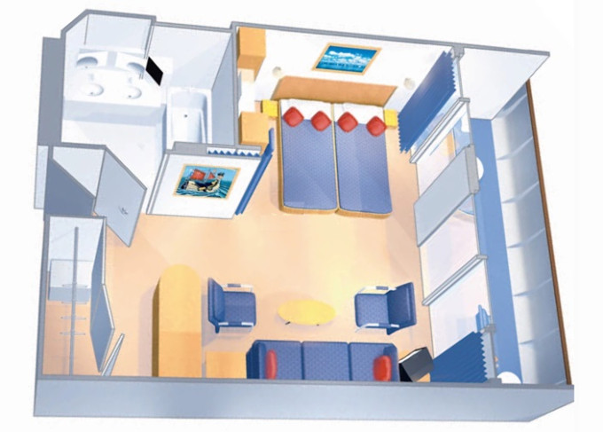 | 4U - Vnitřní kajuta s virtuálním balkonem 14 m². Obrazovka velikosti balkonových dveří s promítaným výhledem. 10. paluba. Max 2 osoby. | 47 777 Kč 11 944 Kč za osobu | ||