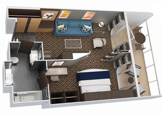 | 3U - Vnitřní kajuta s virtuálním balkonem 15 m². Obrazovka velkosti balkonových dverí s promítaným výhledem. 7. až 12. paluba. Max 2-4 osoby. | 167 418 Kč 41 855 Kč za osobu | ||