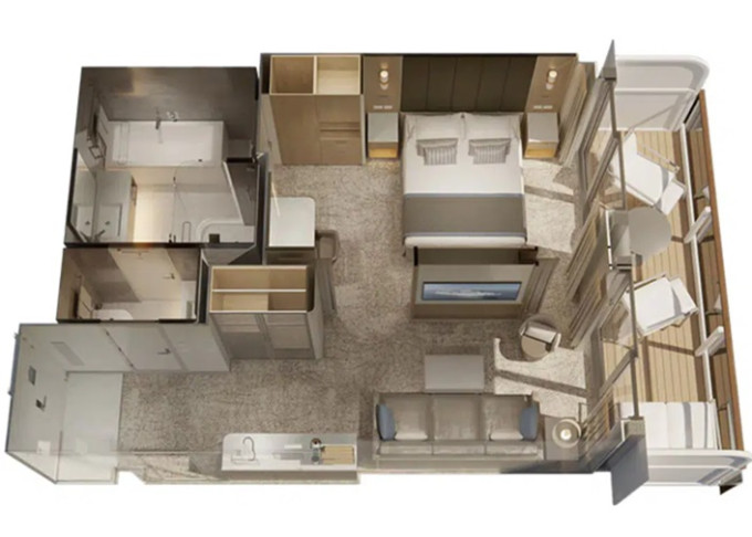 | C1 - Reserve Cabana Mini Suite 30 m² (včetně balkóna a extra lounge). 9. paluba. Výhody Reserve Collection a Výhody Mini Suite. | 251 827 Kč 125 914 Kč za osobu |