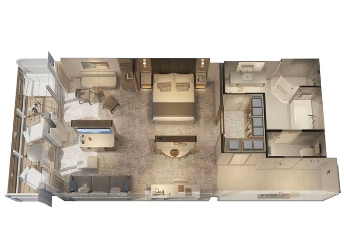 | CB - Cabana Minisuite 31 m² / 6 m² balkón a lounge. 10. paluba. Výhody Cabana. Výhody Mini-Suite. | 233 636 Kč 116 818 Kč za osobu |