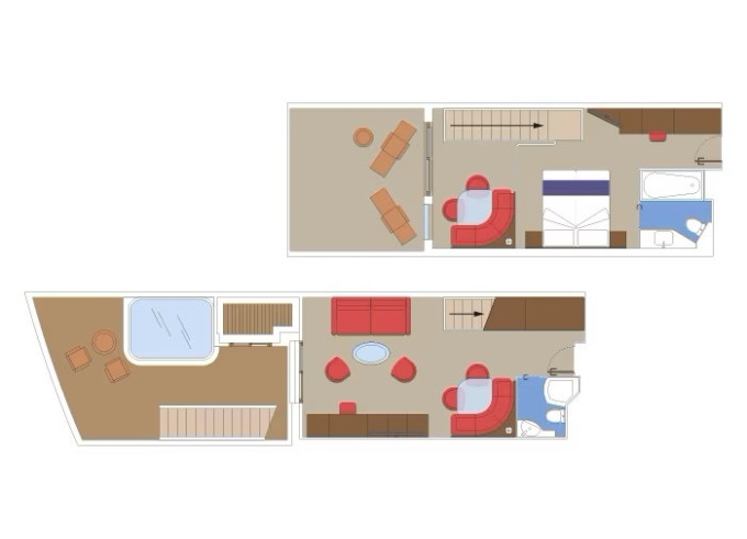 | YJD - Duplex Suite s vířivkou Yacht Club 46 m² + balkón 28 - 31 m². vířivka. Mezonet, šatník, 2 koupelny (1 s vanou). Max 4 osoby. 16. paluba. Cenový model MSC Yacht Club. 96 hodin | 268 644 Kč 268 644 Kč za osobu |