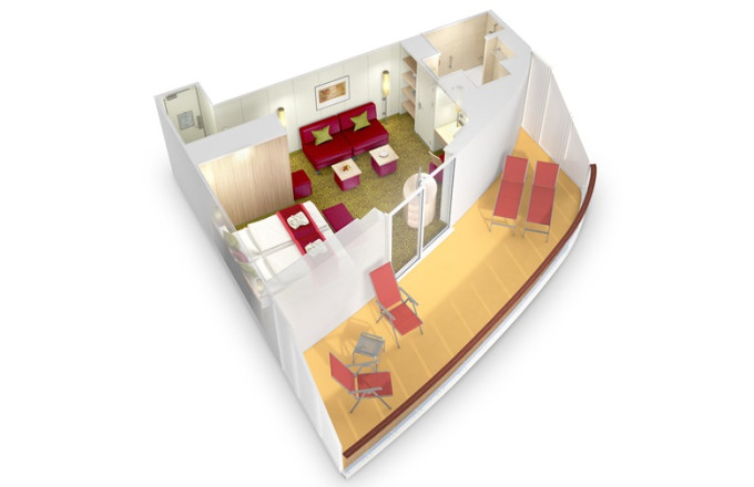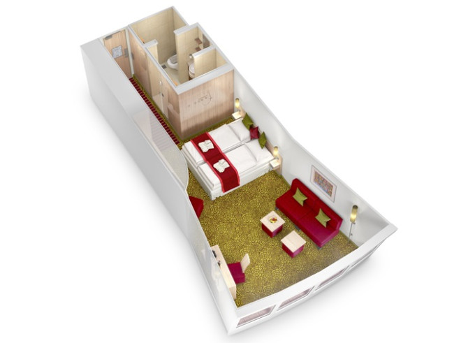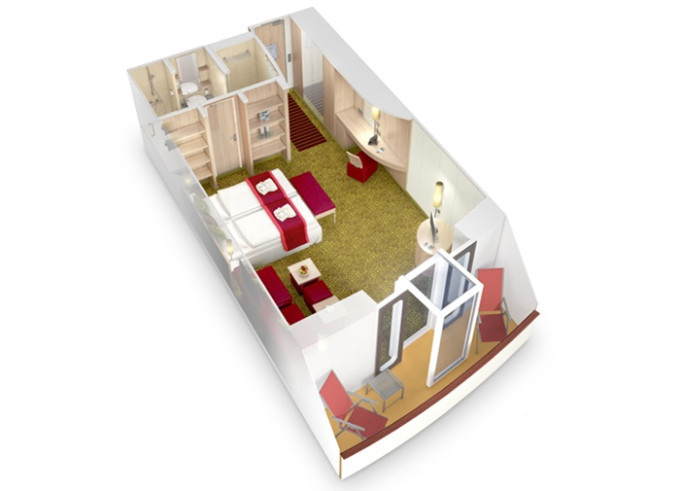Ve všech kajutách se nachází koupelna se sprchou, manželská postel s možnosti oddělit lůžka, dostatek úložných prostor, trezor, vysoušeč vlasů, telefon, televizor, regulovatelná klimatizace.