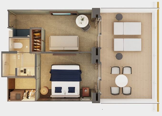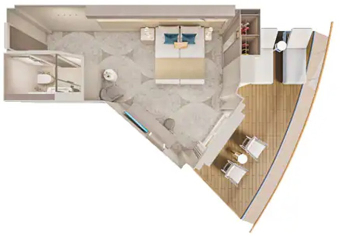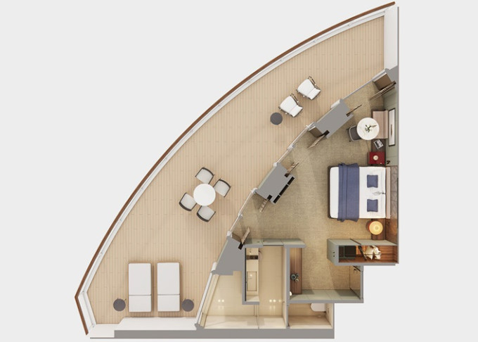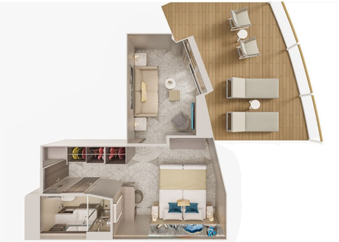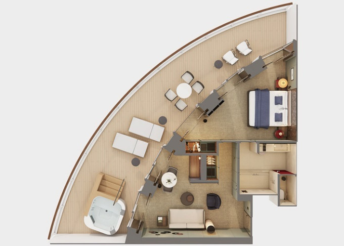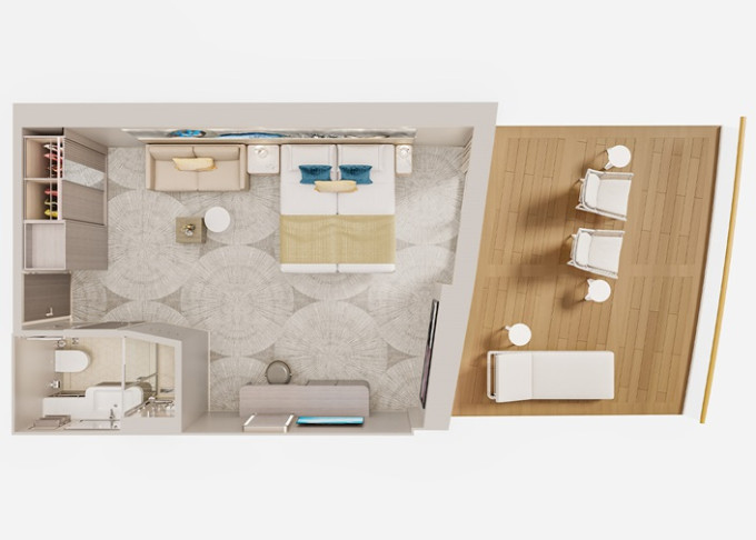 | SH - Suite s velkým balkónem Aft-Facing 59 m² / balkón 34 m². Výhody Suite. 9. paluba - vzadu. Max 4 osoby. | 194 605 Kč 97 302 Kč za osobu |