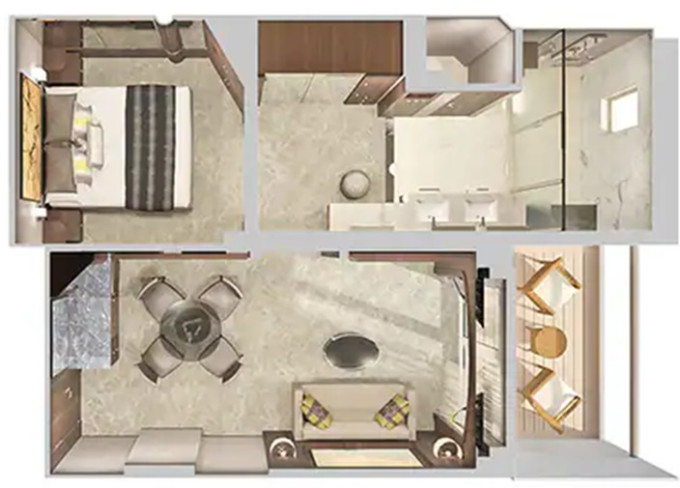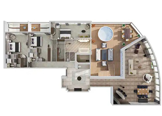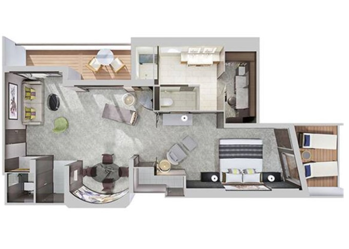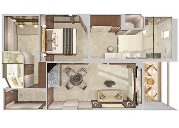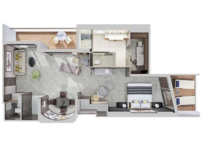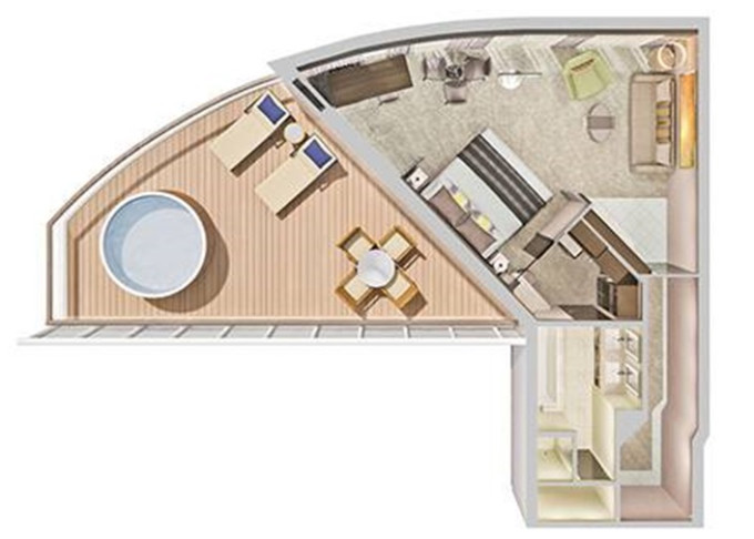 Suite: luxusní varianta ubytování na nejlepších místech na lodi, prostorné a luxusně vybavené; více variant včetně suite v privátní zóně The Haven