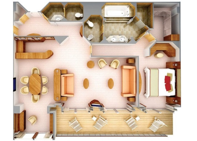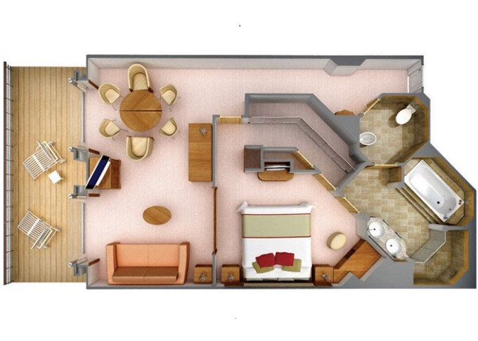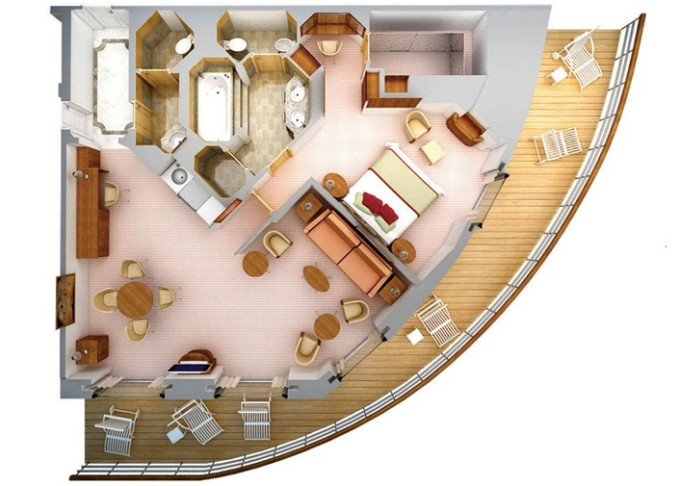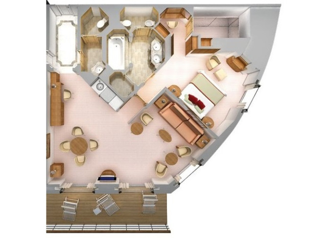 | DX - Deluxe Veranda Suite 29 m² + balkon 6m². Ložnice s oddělitelnou obývací částí. Centrální umístění na palube. | 284 861 Kč 284 861 Kč za osobu | ||