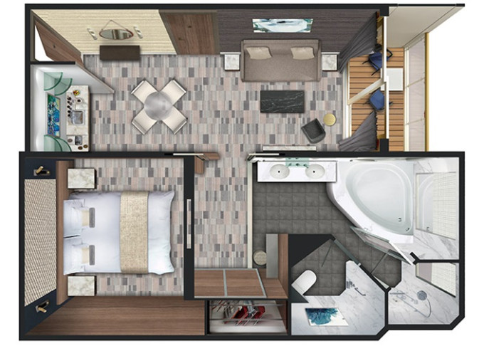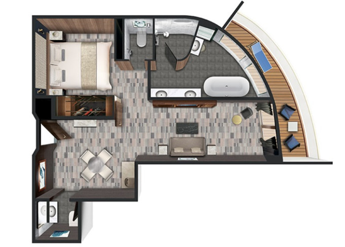 | SE - Forward-facing Penthouse 52 m² / balkon 11 m². Vířivka. Výhody Suite. 10. paluba - vpředu. Max 3 osoby. | 331 288 Kč 165 644 Kč za osobu | ||