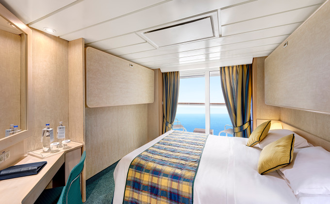 Kajuta s balkónem: 15 - 16 m², kajuta s manželskou postelí (na požádání 2 oddělené postele) a rozkládací pohovka. Klimatizace, koupelna se sprchou nebo vanou a WC, toaletní stolek, prostorná skříň, interaktivní TV, telefon, minibar, sejf, vysoušeč vlasů. Balkony se stolkem a židlemi.