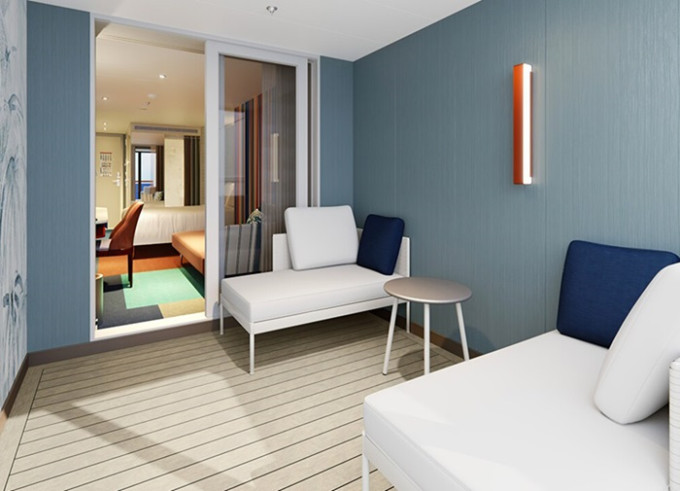 | T2 All Inclusive - Kajuta s balkonem Terrace 19 m² / lounge + balkon 8 m². 9. paluba střed. Cenový model All Inclusive. | 69 866 Kč 17 466 Kč za osobu |