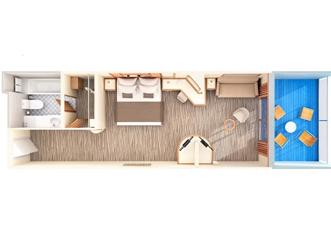 | 8C - Kajuta s balkonem 21,5 m² (včetně balkonu). 11. a 12. paluba. | 45 778 Kč 22 889 Kč za osobu | ||