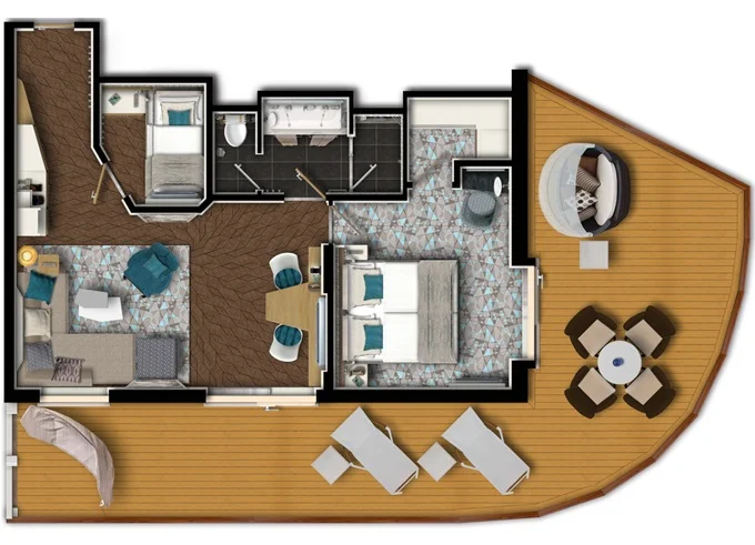 | SUDO - Diamant Suite 42 m² + balkon 47 m² se stolem se 4 židlemi, s houpací sítí, 2 lehátky a postelí Sun island. 2 ložnice, obývací pokoj, Herní konzole. 6. paluba. Max 6 osoby. Výhody Suite. | 528 417 Kč 176 139 Kč za osobu |