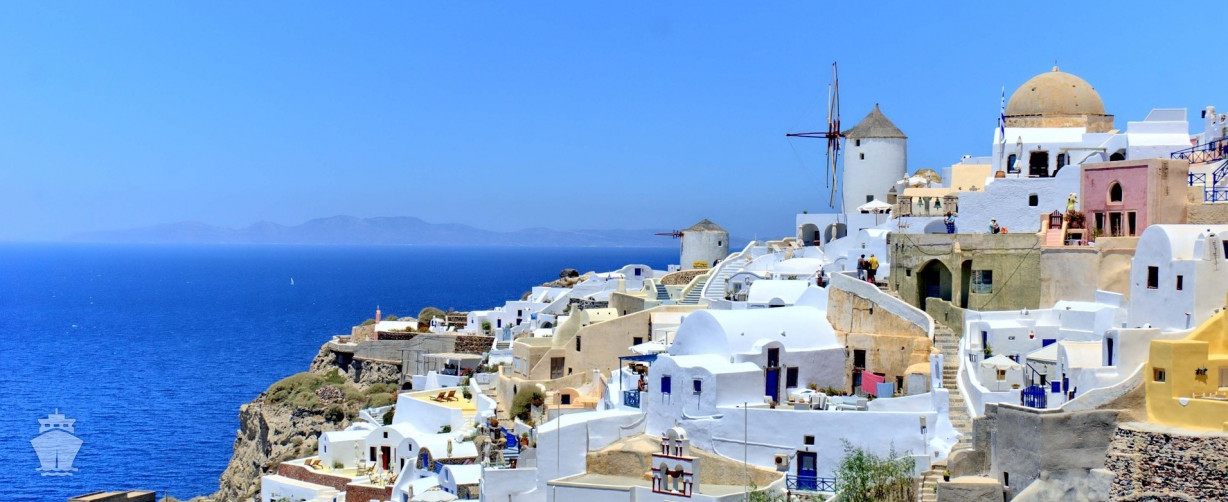 Pro Santorini funguje technický přístav, kde vystupují pouze klienti, kteří jedou na organizovaný výlet. Pro individuální vystoupení na ostrov kotví loď na moři a transfer je realizovaný pomocí člunů.